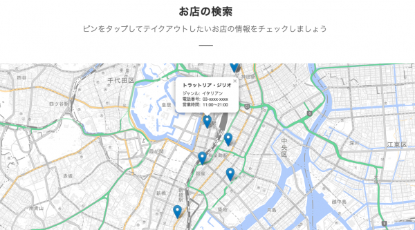 テイクアウトを注文する方は、マップからテイクアウト可能なお店を確認し、召し上がりたいメニューを電話で注文し、お店にて支払いを行うという流れになります。