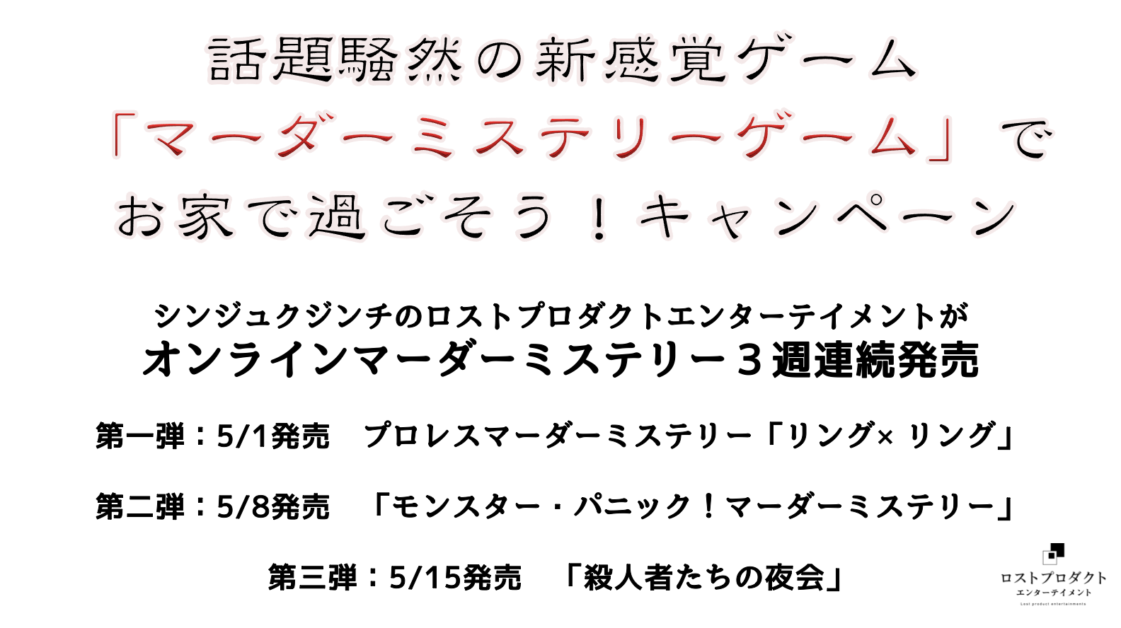 マーダーミステリーゲーム専門スペース「シンジュクジンチ」を運営する合同会社ロストプロダクトエンターテイメント(所在地:東京都新宿区、代表者:中津川輝、以下:ロストプロダクト)は、5/8に、オンラインマーダーミステリーゲームの新商品「モンスターパニック マーダーミステリー」(以下:本商品)を発売します。