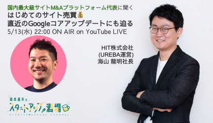 5/13(水)22:00~23:00、Webサイト売買マーケットプレイスUREBAを運営する株式会社HIT(本社:東京都千代田区)代表の海山龍明が、YouTubeチャンネル『坂本達夫のスタートアップ酒場』のYouTube LIVEに出演します。