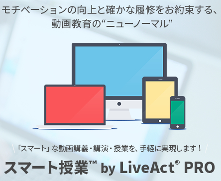 「スマート授業 by LiveAct PRO」は、新型コロナウイルスの影響で通常の授業運営が困難な学校(大高中小学校など)向けに、遠隔での授業運営を支援するための動画サービスです。遠隔授業に必要な機能群を搭載し、従来の一方向の動画講義では不可能だった「対話的な動画教育」を、ITリテラシーや専用の端末を一切必要とせず、手軽に実現します。