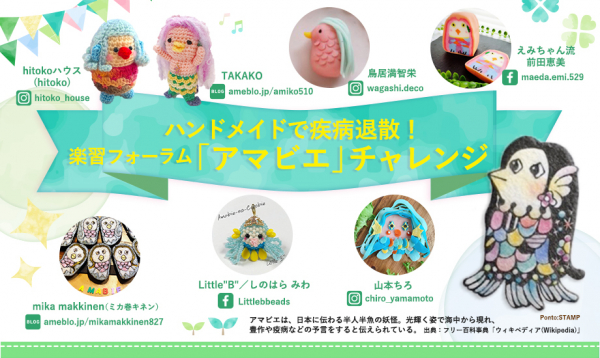 ハンドメイドの資格講座事業を行う株式会社オールアバウトライフワークス(本社:東京都渋谷区、代表取締役社長:菱倉 英一)は、新型コロナウイルス感染症の終息を願って、4月27日から日本の妖怪「アマビエ」のハンドメイド作品投稿イベントを実施中。投稿は誰でも参加することができます。ビーズ、あみぐるみ、刺繍、羊毛フェルト、ペーパークラフト、キャラ弁、デコ巻き寿司、シュガークラフトなどさまざまな分野のテクニックを使った「アマビエ」作品が100点以上集まっています。