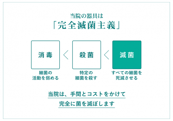 ※「滅菌」とは、菌を滅ぼすという字の如く、すべての細菌を死滅させることを意味します。特定の細菌を殺す意味である「殺菌」は、死滅させる対象や程度については定義されておりません。それに対し、「滅菌」は、「すべて」のという点で徹底した対応が必要とされます。