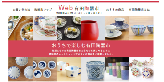 今年の有田陶器市は、新型コロナウイルスの感染拡大に伴い無期限延期となりました。窯元、商社、作家をはじめ有田陶器市を愛する地元の方々、そして毎年来場してくださるお客様や全国のやきものファンの方々の思いに応えるべく、今年初めて“おうちで陶器市気分が楽しめる”「WEB有田陶器市」が2020年4月29日(水)~5月5日(火)に開催されることとなりました。