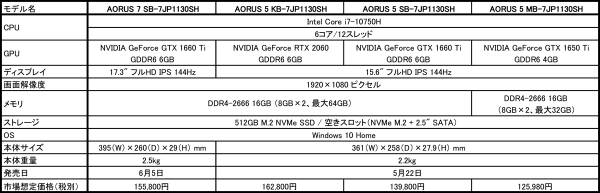 2020年5月15日 - GIGABYTE Technology Co., Ltd. 台湾・新北市 - コンピュータテクノロジーで世界をリードするGIGABYTE Technologyは、ゲーミングノートPC「AORUSシリーズ」のラインナップを拡充し、CPUに6コア/12スレッドの第10世代Intel Core i7-10750Hプロセッサ、GPUにNVIDIA GeForceシリーズを採用した「AORUS 5シリーズ」および「AORUS 7シリーズ」の4製品を発表いたしました。AORUS 5シリーズは5月22日、AORUS 7シリーズは6月5日発売予定で、5月15日より、Amazon.co.jp、アプライド、パソコンSHOPアークにて先行予約販売を開始いたします(最下位モデルのAORUS 5 MB-7JP1130SHはAmazon専売モデルとなります)。