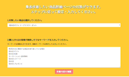 「SEOマスター for BASE」では、SEO対策したい商品を選び、商品に関連するキーワードを登録することで、商品ページのタイトルや商品説明をどのように改善したらよいかなど、具体的なアドバイスが提示されるので、初心者の方でも容易に操作が可能となっています。