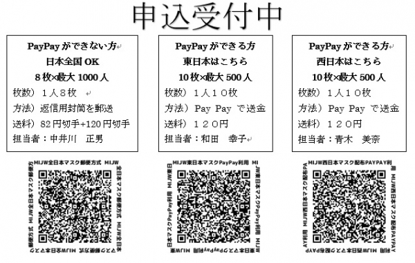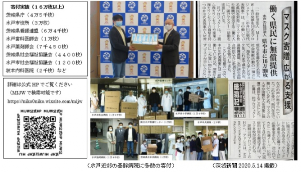 茨城県水戸市の一般社団法人MIJW-水戸発夢を叶えるプロジェクト(代表理事 中井川 正男)は5月18日から日本全国のマスク不足で困っている人を対象にマスクの無償配布を実施している(送料のみ負担)。 同法人はコンサルタント・カウンセラーとして活躍している中井川代表理事が「みんな違って みんな仲間」を合言葉に会社や学生対象の講演活動や人材育成、刑務所での再起支援など「こころ」の面からさまざまな社会貢献事業に取り組んでおり今回のプロジェクトもその一環である。 マスクの無償提供は4月から水戸市を中心に水戸市役所・茨城県庁・医師会・看護協会・歯科医師会・薬剤師会・社会福祉協議会などを通じて16万枚以上実施されている。しかし、それでも医療関係者ですら1人1人に十分には届いていない。日中働く人は買いに行くこともままならず薬局やコンビニでも手に入らず、現在においても入手が難しいと感じる人がまだまだ多いとの情報を得てきた。 そこで、最初は水戸市民の「働く人限定」で困っている本人に手を挙げてもらってプレゼントする企画をスタート。その後茨城県民まで対象を拡大し、今回、MIJWのSBC(Social Business Challenge)の全国のメンバーの協力も得て、(1)日本対象(返送用封筒を同封:切手代が84円+120円で1人8枚)に加えて(2)東日本対象(PayPay払い120円で1人10枚)(3)西日本対象(東日本と同様)と3つの窓口で現在申込を受付けている。詳しくは公式HP参照(https://niko0niko.wixsite.com/mijw)・・・MIJWで検索可能です。
