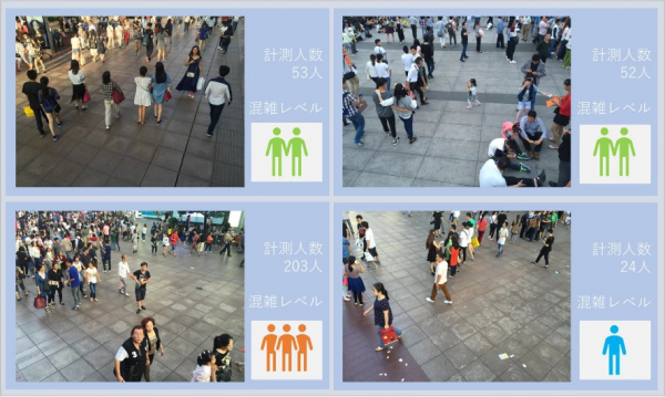 また、昨今の新型コロナウイルスに関する情勢を踏まえ、人の密集情報を視覚的に表現する機能を追加開発し、過度な密集状況が発生しているエリアを逸早く把握することを可能としました。本機能は、人の密集による感染拡大の防止にとどまらず、人の密集による様々な人的被害の抑制等、様々な用途への活用を期待しております。