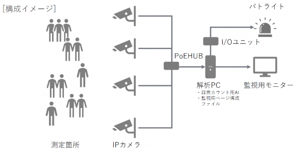 本システムは、設置された防犯カメラの映像を解析し人数の情報を判定し、三角広場内の来場者数が一定数以上になった場合にアラートを自動発報するため、エリアの入場規制などのオペレーションに活用いただきます。