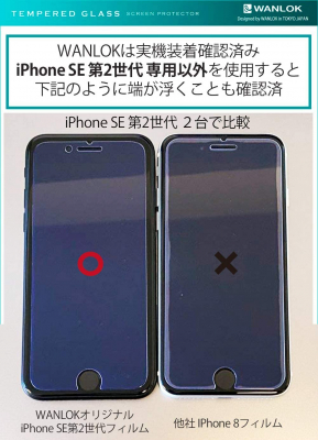 「iPhone 8」から2年半ぶりとなる、4.7型ディスプレイ搭載モデル、アップルコンピュータ製『iPhone SE 第2世代』が発売。WANLOKでは、実機をいち早く入手、今話題となっている問題「iphone se 画面 浮き」を解消した、浮かない強力吸着タイプガラスフィルムを開発し、この度、WANLOKの代名詞ともなっている『ブルーライトカット版』も、数々の問題を解決し、最高の仕上がりで完成、ついにアマゾンジャパンにて2020年5月18日(月)に、発売開始しました。既存の同サイズiPhone8用ガラスではフィルムが浮いてしまう問題は、こちらのWANLOKが開発したガラスフィルムで解決です。デザインにもこだわりを持って制作。黒フレーム付きで、実機と一体化したフィルムはおしゃれで、最高級の指すべりも特徴。