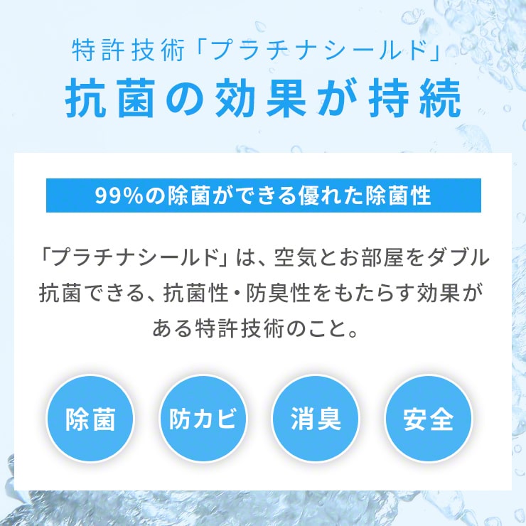 ・特許取得の「プラチナシールド」で、カビや菌、ウイルスが99%減少