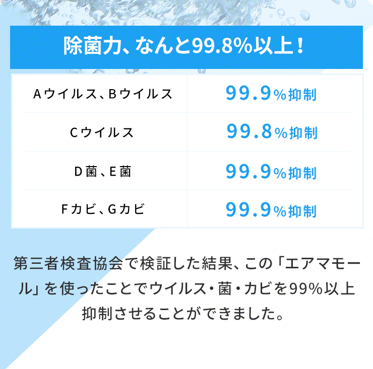 エアマモールは抗菌性・防臭性をもたらす効果がある特許技術「プラチナシールド」を用いており、菌の増殖を抑え、空気・部屋を清潔な状態に保ちます。第三者検査協会で検証した結果、エアマモールを使ったことで、ウイルス・菌・カビを99%以上抑制させることができました。