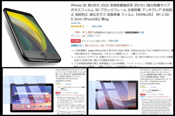 不当と思われるレビューの投稿されている商品は以下の3商品です。