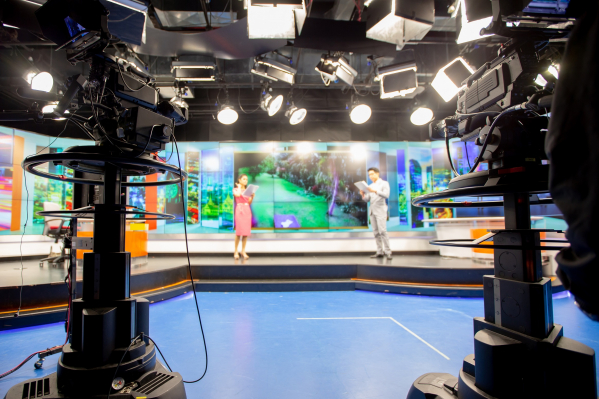全国に拠点をもつB社では、経営陣から全社員に向けた商況報告をするために、バーチャルセットを使ったライブ配信を実施。CGを駆使したバーチャル空間と、ニュース番組風の演出を加えることで、情報をより効果的に伝えました。