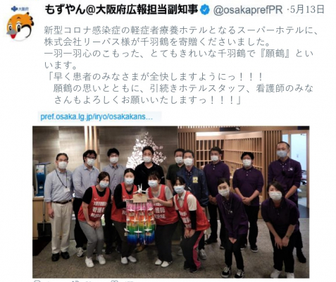 (願鶴贈呈式第一弾)2020年5月13日に「スーパーホテル大阪天然温泉」(無症状者及び軽症者受入施設大阪第1号)