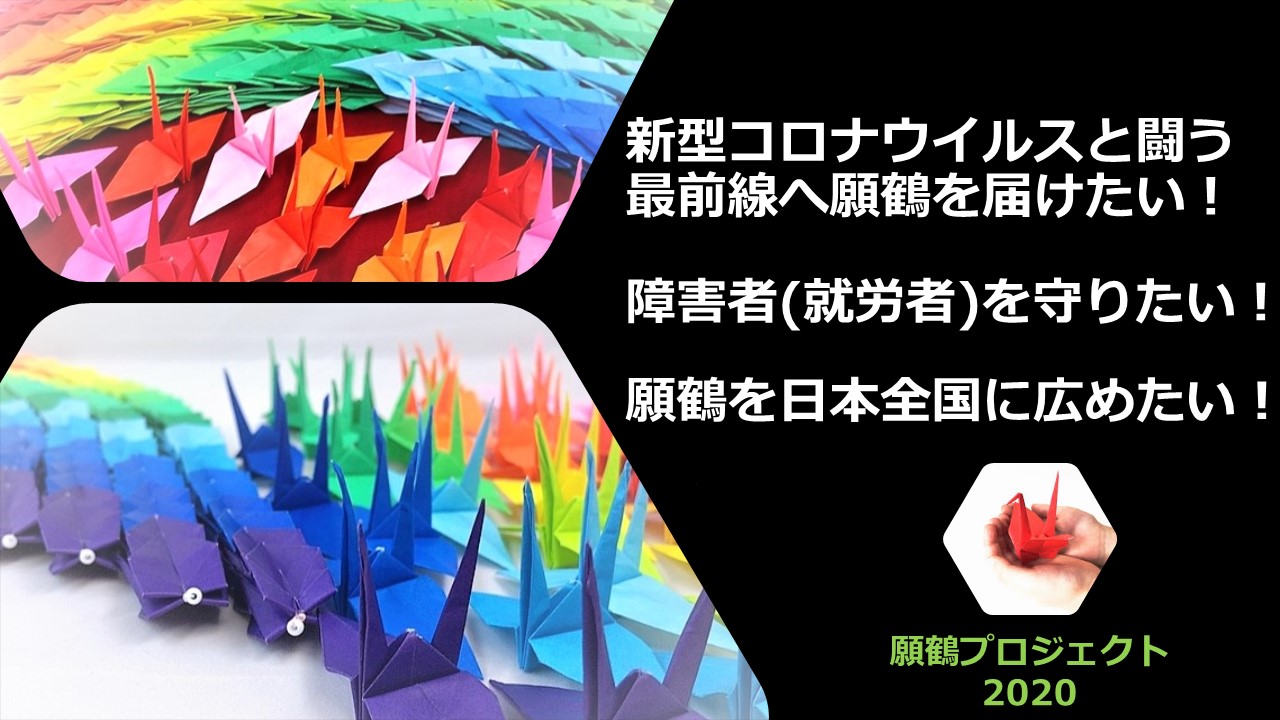 新型コロナウイルスの影響で運営する障がい者就労施設の仕事が激減し、困窮する就労者(障害者)の仕事を作るため!生活を守るため!に自宅でも作業できる千羽鶴を作る仕事を実行しました。その就労者が作った千羽鶴を新型コロナウイルスと戦う感染者・医療関係者・受入施設へ【願鶴negaizuru】として支援者様の応援エール絵馬と共に届ける活動を現在大阪にて行っております。この反響ある活動を全国に広めたくPROJECT化しました。