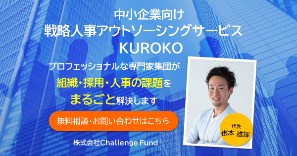 株式会社Challenge Fund(本社:東京都港区、代表取締役:根本雄輝、以下、当社)は、中小企業に特化した戦略人事アウトソーシングサービス『KUROKO(読み:クロコ)/https://kuroko.challengefund.co.jp/lp-service』を2020年6月1日から提供開始します。