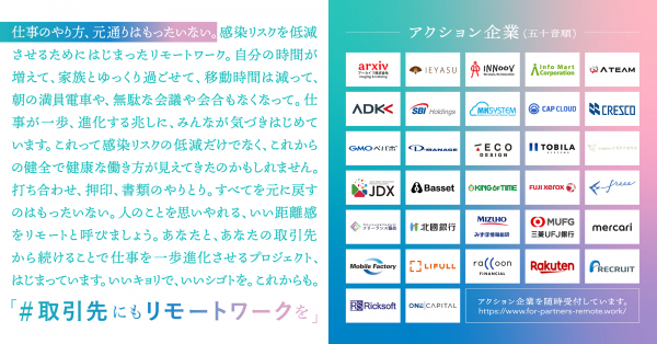 緊急事態宣言解除後も、一斉にコロナショック前の状態に戻すのではなく、引き続き、取引先もリモートワークしやすくなるよう、思いやりを持った事業運営に取り組んでいくことを、各社賛同理由の想いと共に特設サイトで発信していきます。