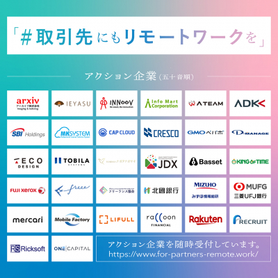 より多くの企業・団体のリモートワークを推進していく為に、引き続き、賛同企業を募集しています。「 #取引先にもリモートワークを 」に賛同いただける方は以下フォームからご登録ください。