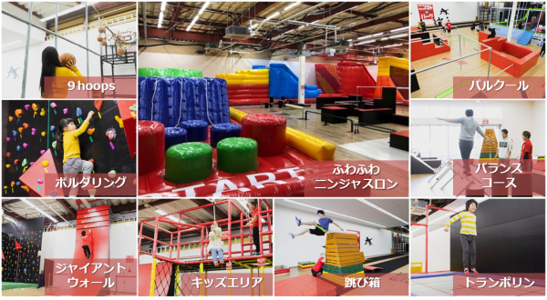 (ふわふわニンジャスロン・パルクール・バランスコース・トランポリン・ ボルダリング・跳び箱(モンスターボックス)・9hoops(バスケットボールゲーム)・ジャイアントウォール・キッズエリア・ロープクライミング)