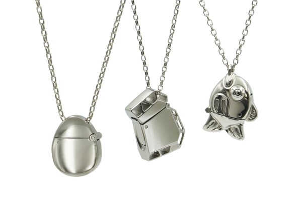 純チタニウムを削り出したペンダント型ピルケース。チェーンや金具も全てチタニウム製です。味気なくなりがちなピルケースを、個性的なアクセサリーとしてデザインしています。デザインは3種。つるんとした卵型の『Egg』(エッグ)、建築のトラス構造がモチーフの『TRUSS』(トラス)、個性的な魚のモチーフ『Fish』(フィッシュ)。ボタンと小さな蝶番で開閉し、フタと本体がつながっているので落下での紛失がありません。