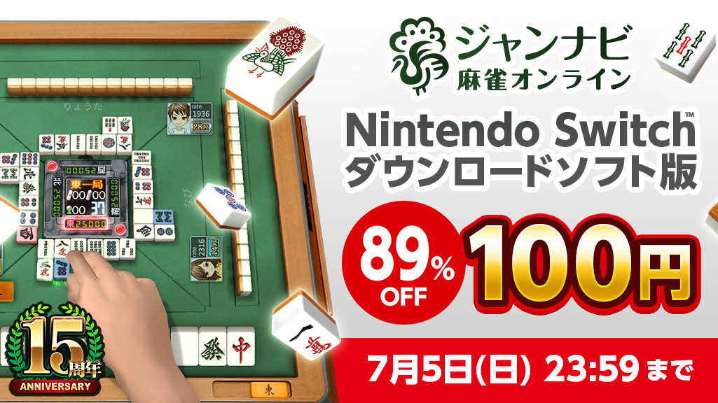 任天堂の公式オンラインストア(マイニンテンドーストア)から、期間限定で通常時よりも89%OFFのお値段で、Nintendo Switch(TM)ダウンロード版の『ジャンナビ麻雀オンライン』をお買い求めいただくことができます。