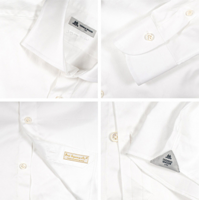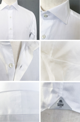 また、シャツの美しさ重要な基準である運針も生地に合わせ、できる限り細かな20ステッチ前後。前立ては、襟台釦を外して着た時の襟もとの美しさを考えたオリジナルのナポリ裏前立てとこだわりの仕様となっている。