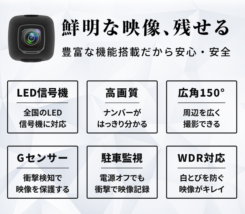 ・150°の広角レンズで広範囲を記録、白飛びや黒つぶれを防ぐWDR機能付き