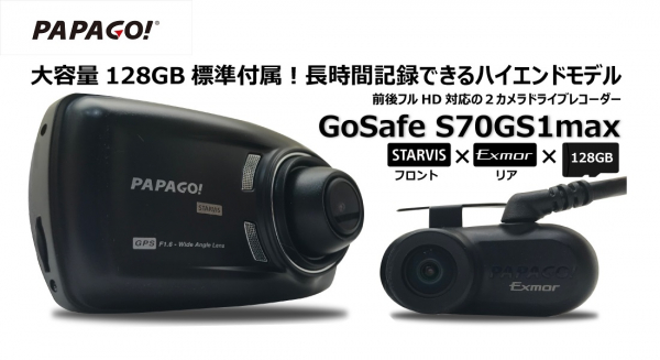 PAPAGO JAPAN株式会社は、前後フルHD映像を約13時間半の長時間記録できる大容量128GBを付属したハイエンド2カメラドライブレコーダー「GoSafe S70GS1max」をWEB限定モデルとして6月11日(木)から発売いたします。