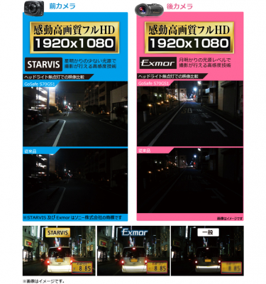 カメラの目と言われるイメージセンサーは光を電気信号へ変換する半導体で、その性能によって画質が異なります。本製品はフロント側に星明かりの光源で夜間撮影を可能にした高感度技術をSONY STARVIS、リア側にSONY Exmorイメージセンサーを組み合わせて採用しているので暗所でも人やクルマを鮮明に記録します。 ※STARVIS、Exmoはソニー株式会社の商標です。