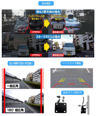 ・超広角180° で一般的なリアカメラで撮影できなかった角度をしっかり記録できます。