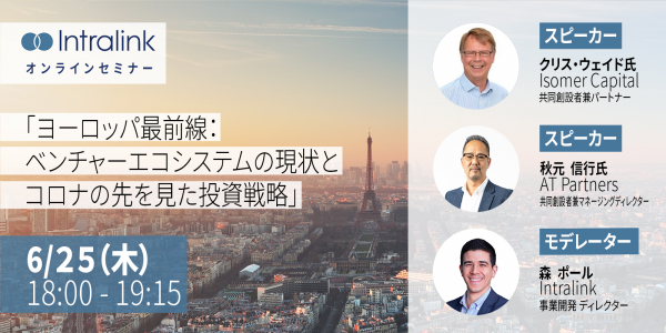 スピーカーには、ベンチャーキャピタリストとして欧州エコシステムに精通するIsomer Capitalの共同創設者兼パートナーのクリス・ウェイド(Chris Wade)氏とAT Partnersの共同創設者兼マネージングディレクターの秋元信行氏を迎え、最新の欧州スタートアップや投資環境に関する解説だけでなく、新型コロナウイルスの感染拡大が投資戦略に与えうる影響や、その先にあるビジネスチャンスを日本企業がどのようにして掴んで行くべきか、という点に触れながら講演いただきます。さらに、欧州政府機関が主催する経済交流プログラムに従事した経験を持つイントラリンク東京オフィス、事業開発ディレクターの森ポールもモデレーターとして参加いたします。参加をご希望される方は、下記よりお申し込みください。