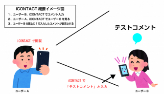 iCONTACTは端末(A)を通して閲覧することで、端末(B)で入力したコメントを確認することができます。(以下 左、スクリーンショット画面 右、概要イメージ図)