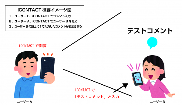 iCONTACTは端末(A)を通して閲覧することで、端末(B)で入力したコメントを確認することができます。(以下 左、スクリーンショット画面 右、概要イメージ図)