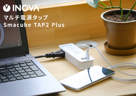 Smacube TAP2 Plusは、家庭やオフィスでも使いやすい長さ1mの電源ケーブルを備え、また出張先や旅行時など持ち運びしやすさに配慮した形状のマルチ電源タップです。
