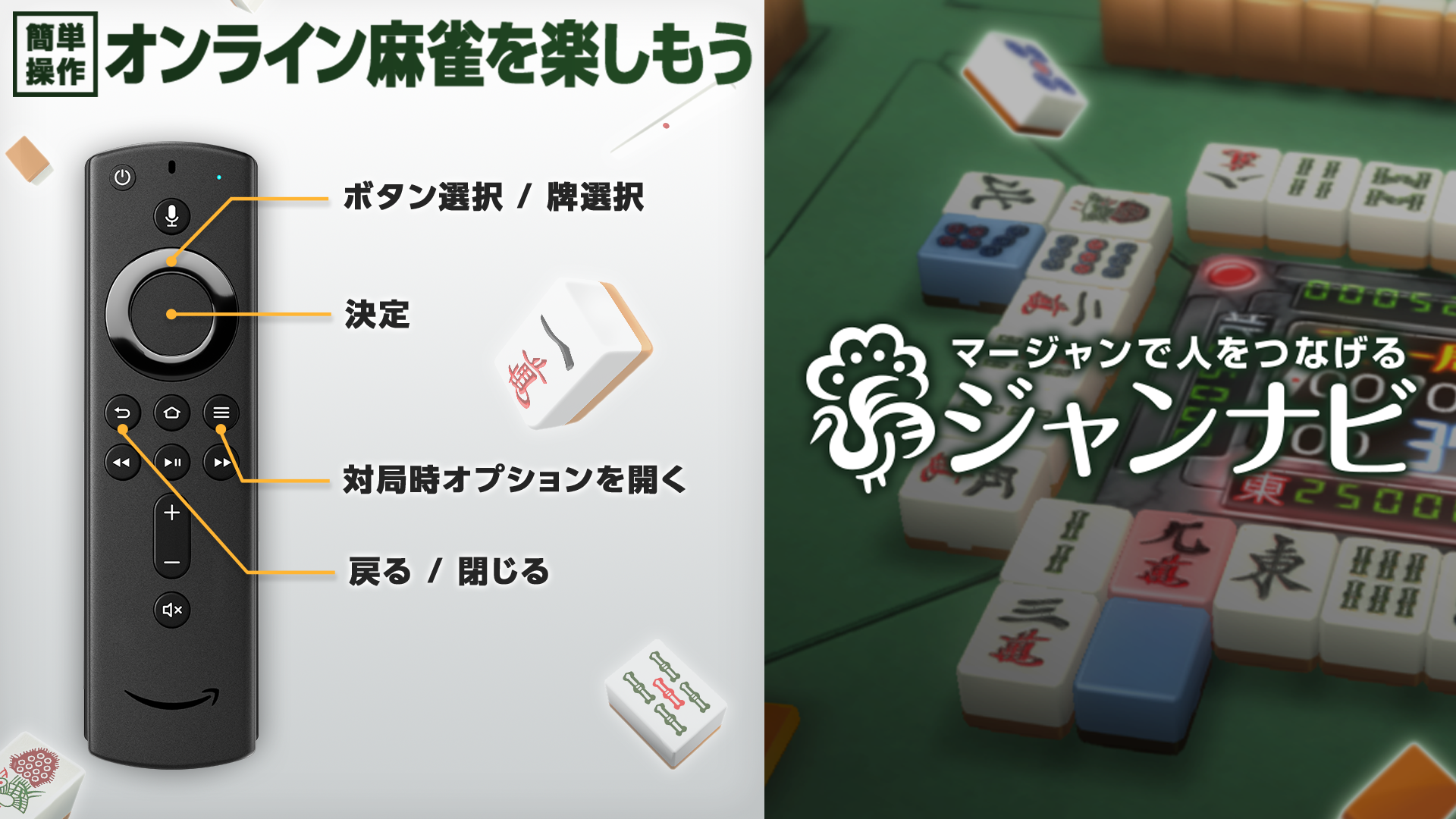 この機会にAmazon Fire TV版「ジャンナビ麻雀オンライン」をダウンロードし、是非、他では味わえない麻雀ゲームをご体験くださいませ。