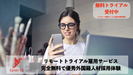 また、外国籍社員採用時に企業が求める要件として、”日本語力”がトップにきます。次に重視される点は、”コミュニケーション力”です。これらの要件を十分に満たせることができる人材か採用決定までに見分けたい企業側のニーズが存在します。そこで、キャリアフライは外国籍人材採用に一歩踏み出す機会となる”リモートトライアル雇用”サービスを企業へ提供致します!