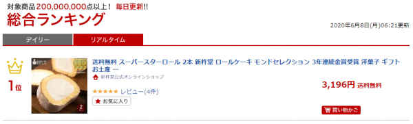 岐阜県中津川【新杵堂】「スーパースターロール」楽天ランキングデイリー総合1位を獲得! (2020年6月8日時点)