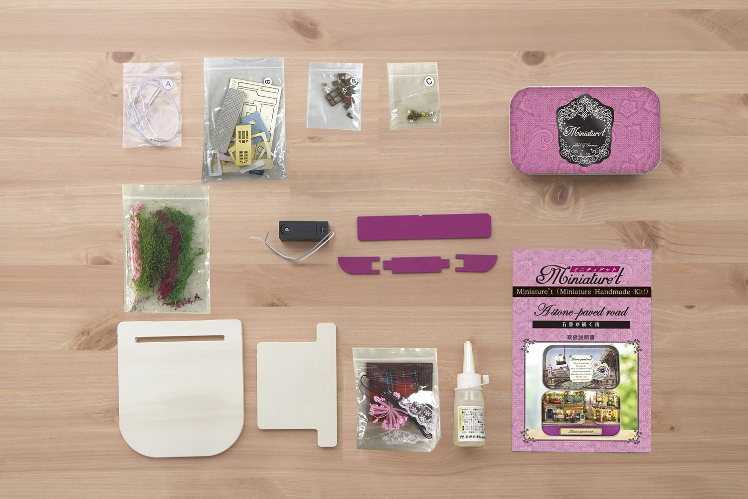 【ミニチュアット】は説明書を見ながら、カッターやはさみ、付属の接着材などを使って部材を切ったり貼ったりして缶の中に可愛らしい小さな世界を作っていくミニチュアドールハウス手作りキットです。そして、付属のLEDライトで完成させたその小さな世界を灯すことが出来ます。缶の中にすべてを収めて小さな世界観を作る「ミニチュアット」は作っている時でも、完成後飾る時でも小さなスペースがあればお楽しみ頂けます。