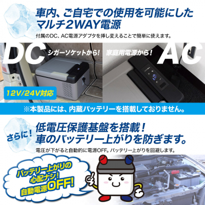 車中泊、長距離ドライブには車のシガーソケットから、セカンド冷蔵庫としてお部屋の家庭用電源からも使用可能です。