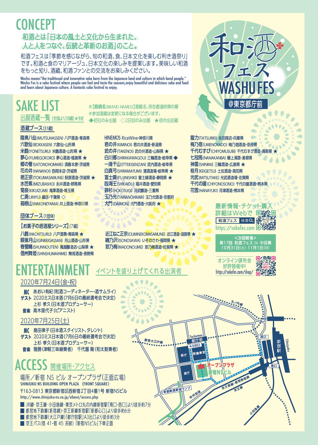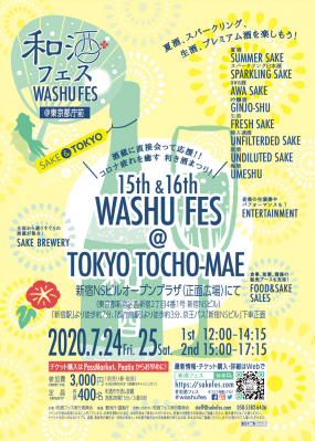 和酒フェス実行委員会は、『第15&16回 和酒フェス @ 東京都庁前』を東京都庁の目の前にある新宿NSビル・オープンプラザ(正面広場、東京都新宿区)で、東京オリンピック2020開会予定日だった7月24日(金)と25日(土)に開催いたします。新宿NSビルのアクセスは、都営大江戸線・都庁前駅から徒歩約3分、都営新宿線・新宿駅から徒歩約6分、JR・京王線・小田急線・丸の内線の新宿駅(南口・西口)から徒歩約7分です。