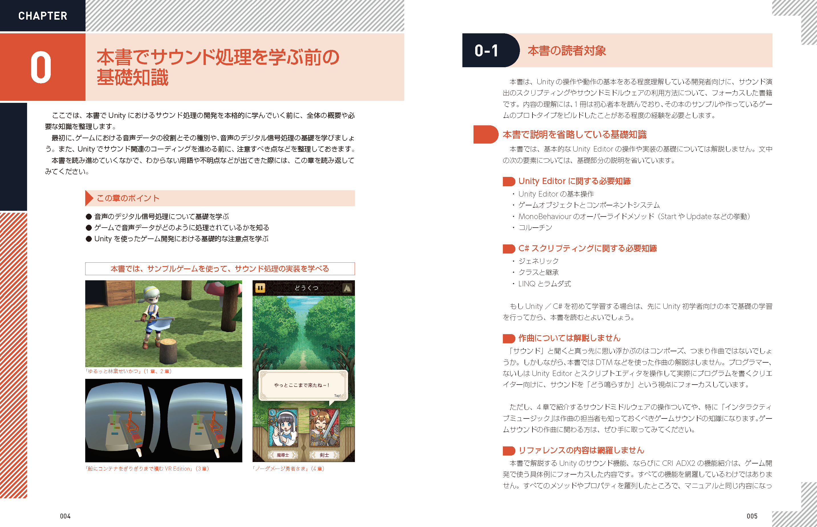 なお、本書は「音楽ゲーム」だけの書籍ではありません。サウンドの知識はあらゆるゲームで必要です。「シューティング」や「アクションゲーム」ならば、大量に再生する音の制御が役に立ちます。「アドベンチャーゲーム」ならセリフの圧縮や再生制御など、ほぼすべてのゲームジャンルで役立つ情報を掲載しています。