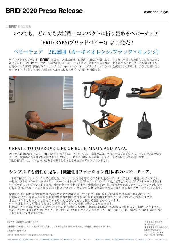 ママとパパどちらの暮らしも向上させるプロダクトブランドBRID BABY(R)(メルクロス株式会社/東京都中央区日本橋)が、6月30日、折り畳み可能で、持ち運べるベビーチェアを発表しました。自宅のインテリアに馴染むカラーリング(カーキ×オレンジ)(ブラック×オレンジ)を採用し、外出時には、お気に入りのフライトジャケットMA-1を着るかのように使えるナイロン素材が特徴です。