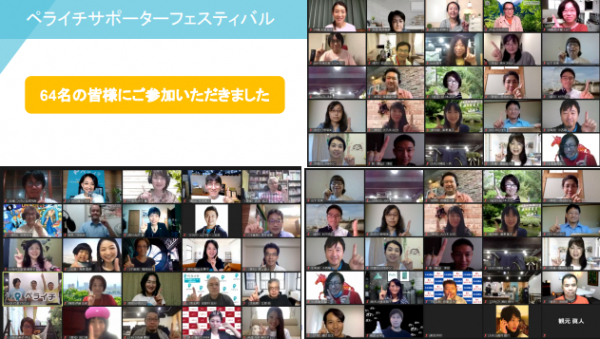 「ペライチサポーターフェスティバル」は、サポーター同士、および「ペライチ」とサポーターの方々とのコミュニケーションをより深めるために開催され、全国のサポーター約70名にご参加いただきました。当日は新型コロナウイルス感染拡大防止のために3密を避け、安心安全にご参加いただけるよう、Web会議システムを使用したオンラインでのイベントとなりました。