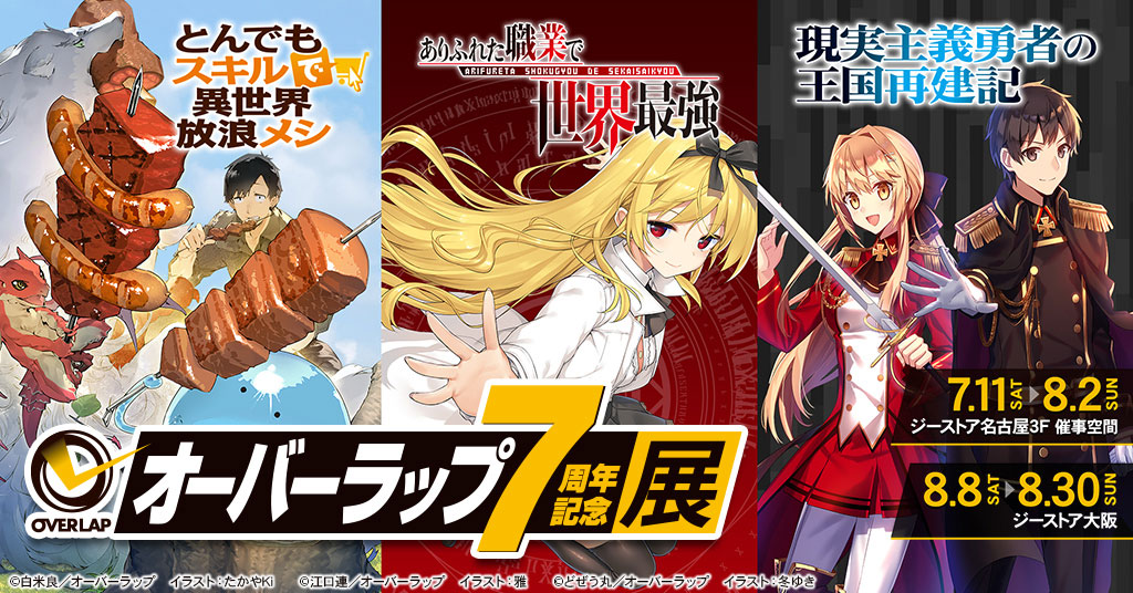 全国6店舗(秋葉原・仙台・大阪・大阪ANNEX・名古屋・福岡)展開中のキャラクター・ライフスタイル・ストア「ジーストア」の運営などを手掛ける「タブリエ・マーケティング株式会社」は、『ありふれた職業で世界最強』など数々の人気作を送り出すオーバーラップの7周年を記念した「『オーバーラップ7周年記念』展」を、2020年7月11日(土)~8月2日(日) ジーストア名古屋3F 催事空間、2020年8月8日(土)~8月30日(日) ジーストア大阪で開催することを発表した。