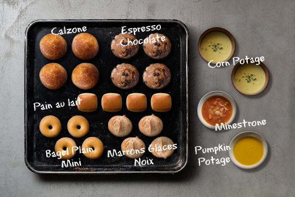 種類方法にお召し上がりいただけるよう、一回り小ぶりサイズのパンと人気のスープがセットに。