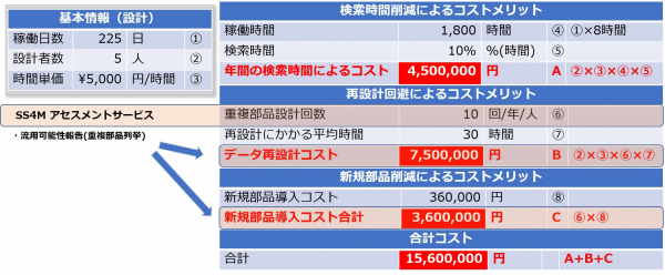また、その後のメンテナンスとして類似形状検索システムSS4Mを導入した際の「再設計に要する時間削減」「新規部品導入費削減」の具体的なコスト削減金額を算出することができるようになります。