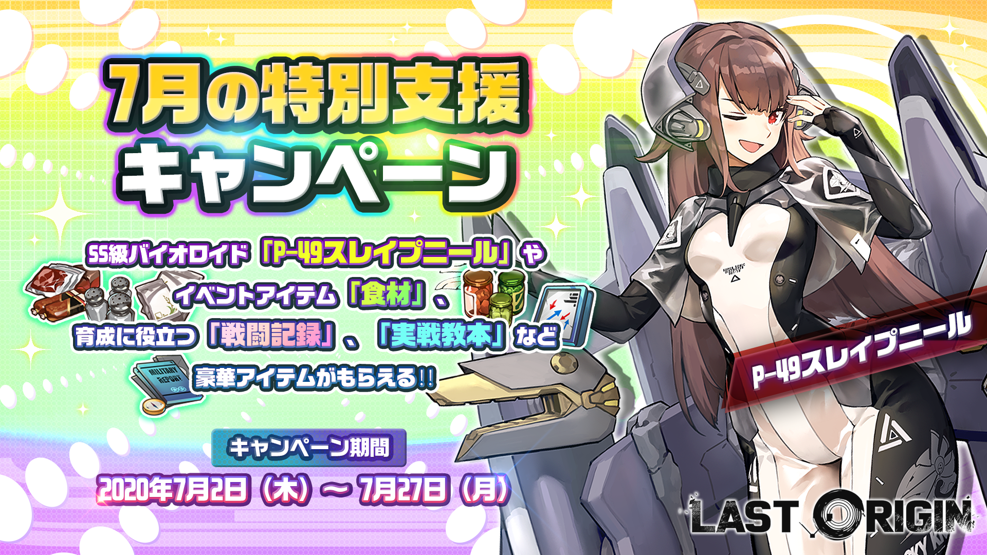 また、SS級バイオロイド「P-49スレイプニール」や育成に役立つアイテムなど、様々な支援物資が貰える「7月の特別支援キャンペーン」や、公式Twitterでの「5日連続声優サイン色紙プレゼントキャンペーン!!」も開始となりましたので、併せてお知らせいたします。