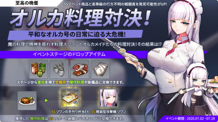イベント交換所では、獲得した「食材アイテム」を使用し、SS級軽装型攻撃機「ソワン」や「ソワンの手作り弁当EX(SSランク補助装備)」などの豪華商品と交換することができます。