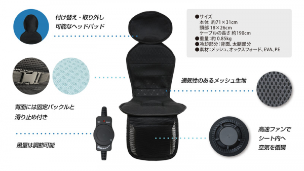 シートにファン(送風機)が付いているので、取り込んだ空気がシート内を循環し、熱がこもりにくくなっています。さらに、メッシュ素材で通気性がよくムレにくいため、汗っかきなお子様も快適に過ごせます。風量もボリュームスイッチで調節可能なので、シーンに合わせて変更することができます。USB電源なので、モバイルバッテリーがあればどこでも使用可能です。