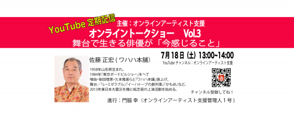出演者:佐藤 正宏(ワハハ本舗),進行:門脇幸(オンラインアーティスト支援管理人1号)